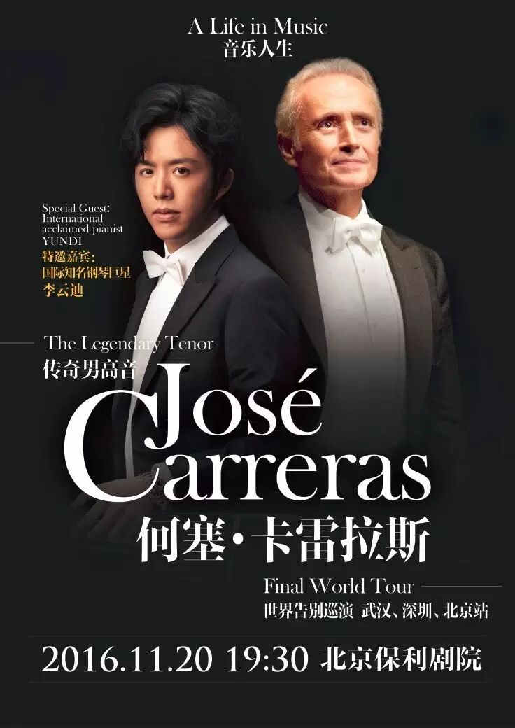 由北京保利剧院独家主办的《音乐人生—何塞·卡雷拉斯世界告别巡演》中国站演出将于2016年11月8日、12日、20日三天分别在武汉、深圳、北京三地举办。今年也适逢北京保利剧院管理有限公司正式成立13周年。13年里,北京保利剧院将众多优秀演出作品搬上舞台,打造具有综合特色的文化演出阵地。11月,让我们相约保利剧院,一睹大师的传奇风采,共享浪漫升级的音乐盛宴!北京站特别邀请李云迪隆重加盟,两位世界级乐坛巨星的首度同台,献上极致音乐盛宴。